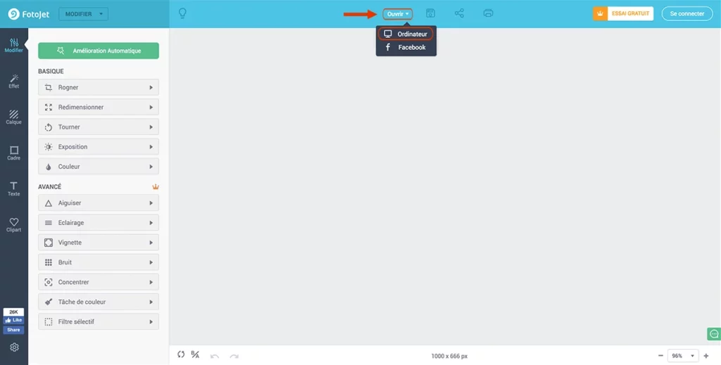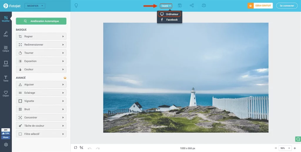 Cliquez sur « Ouvrir » puis « Ordinateur » pour importer une image à retoucher. Ici notre image originale fait