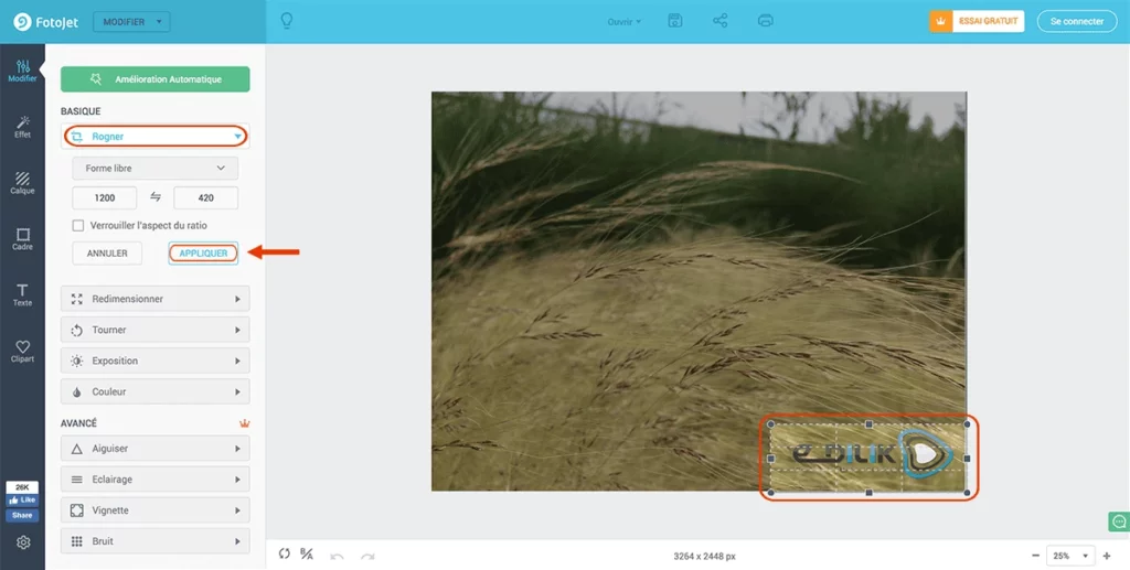 Un fois votre image importer, cliquez sur « Rogner », modifier la taille, déplacer la fenêtre sur l’image si besoin puis cliquez sur « APPLIQUEZ »