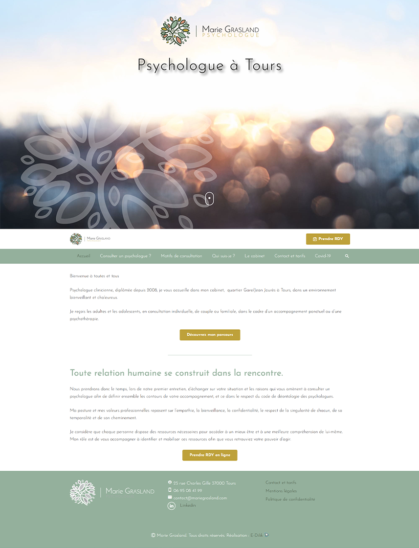 Vectorisation et création du logo à partir d’un dessin (fourni) et création du site internet pour Marie Grasland psychologue à Tour.