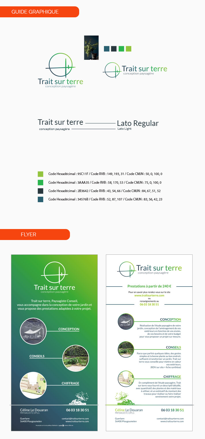 Création de logo, carte de visite, flyer (10v21cm) et site internet pour l’entreprise de conception paysagère Trait sur terre.